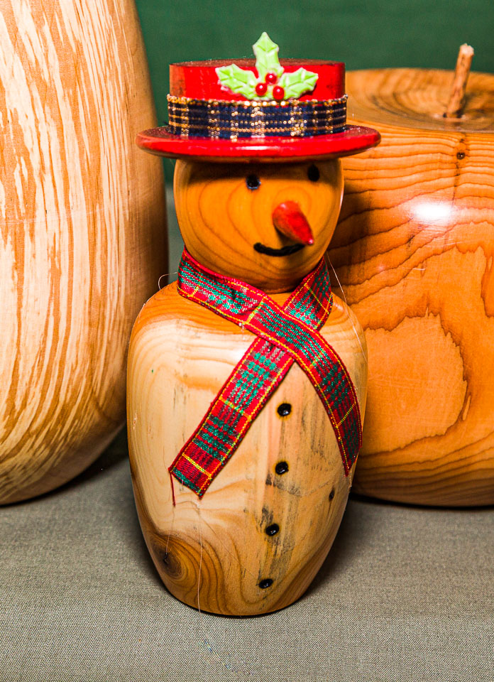 A competition for a Seasonal figure includes both Christmas theme figures and snowmen. Other pieces shown included large pears and apples plus vase forms, pyrography, and dishes and bowls.