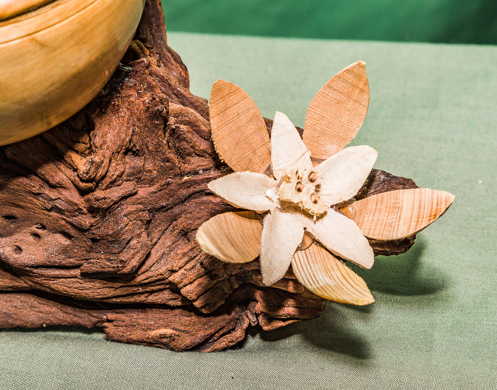 Allen Atkins brought a fluted bud vase in Sepele; a dish in Elm and demo'd turning a sphere in Yew...