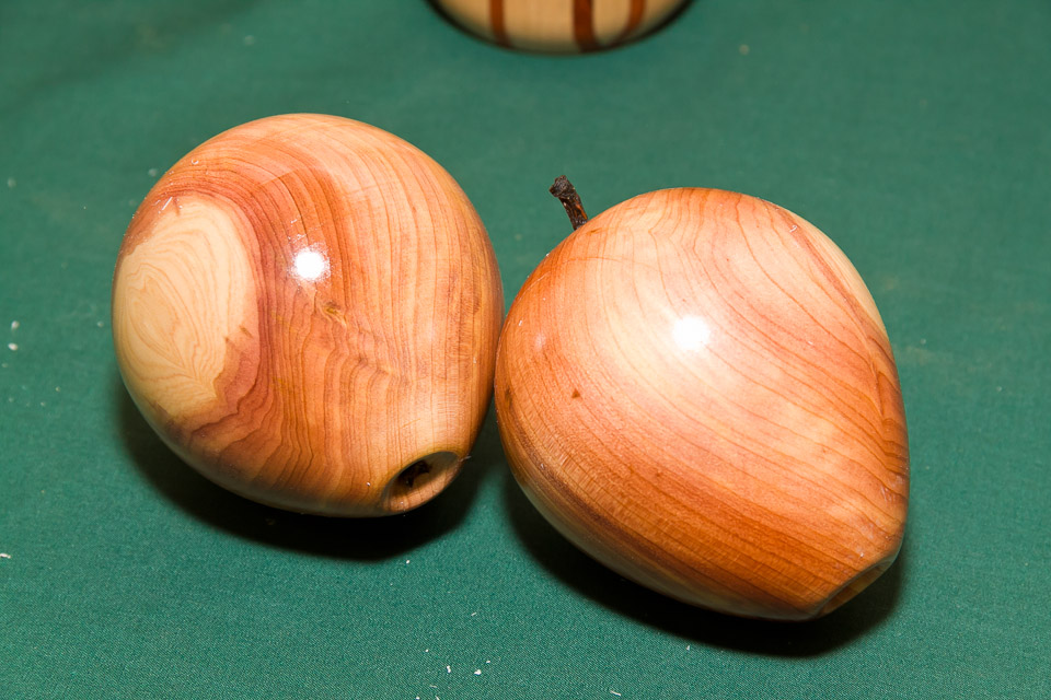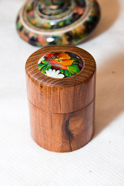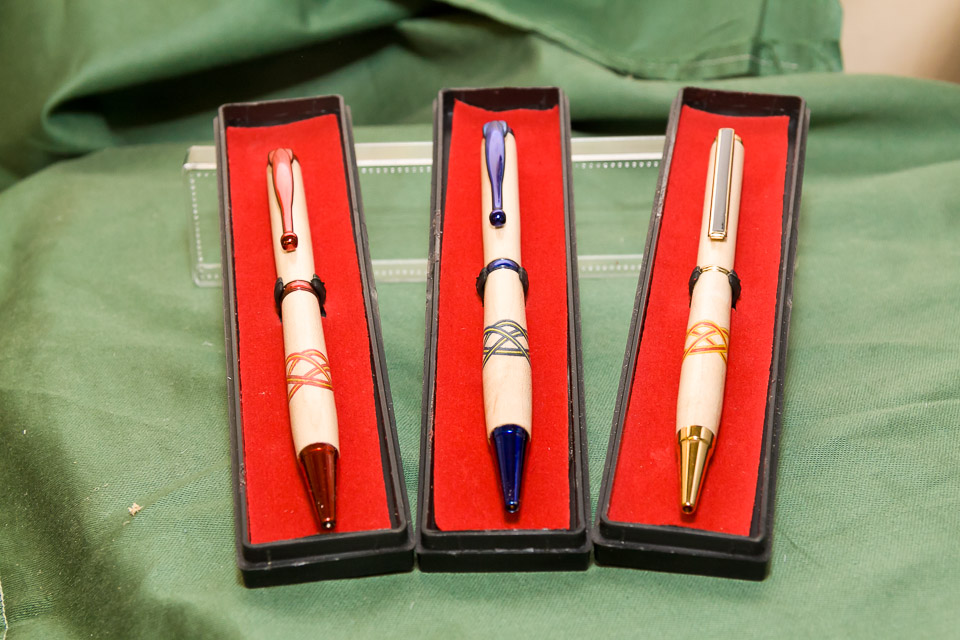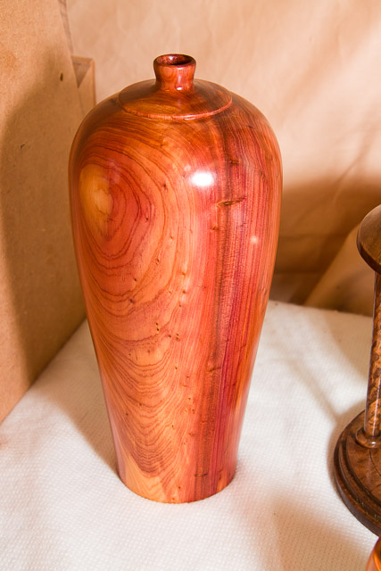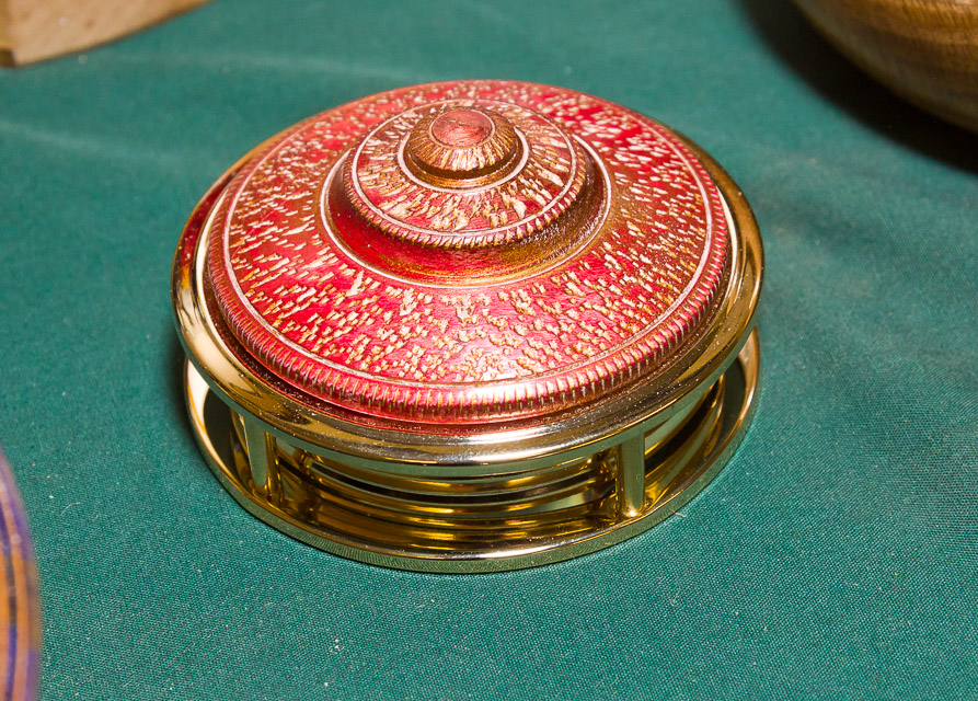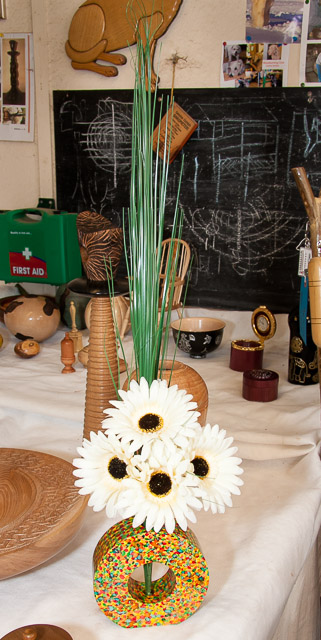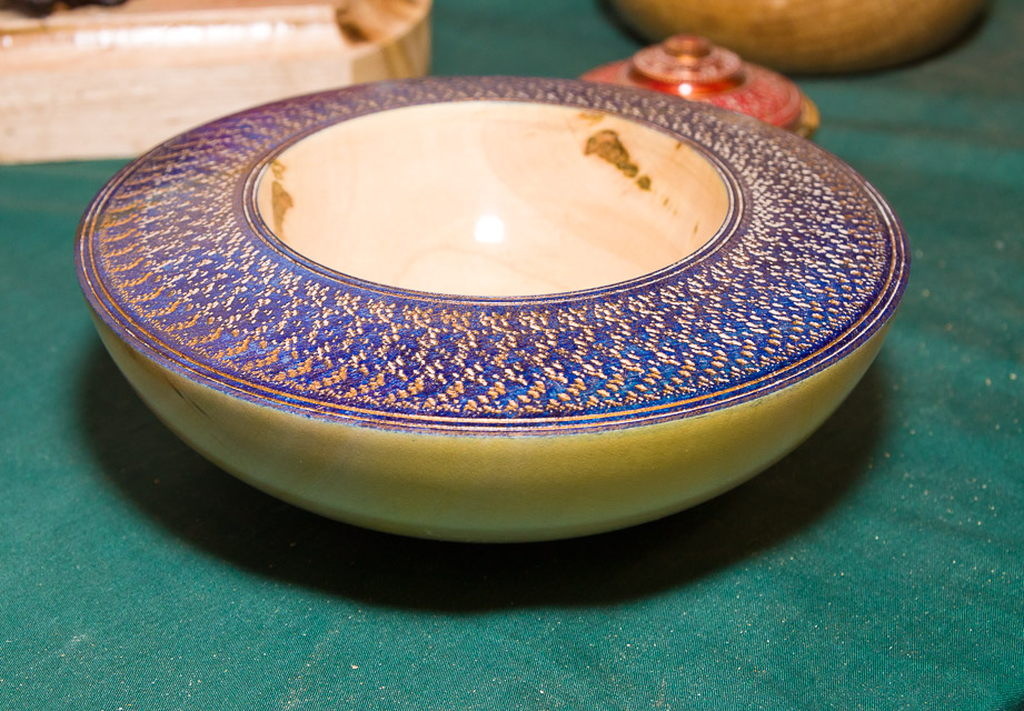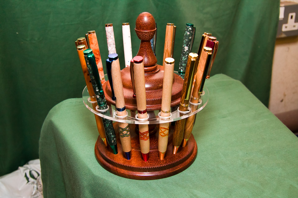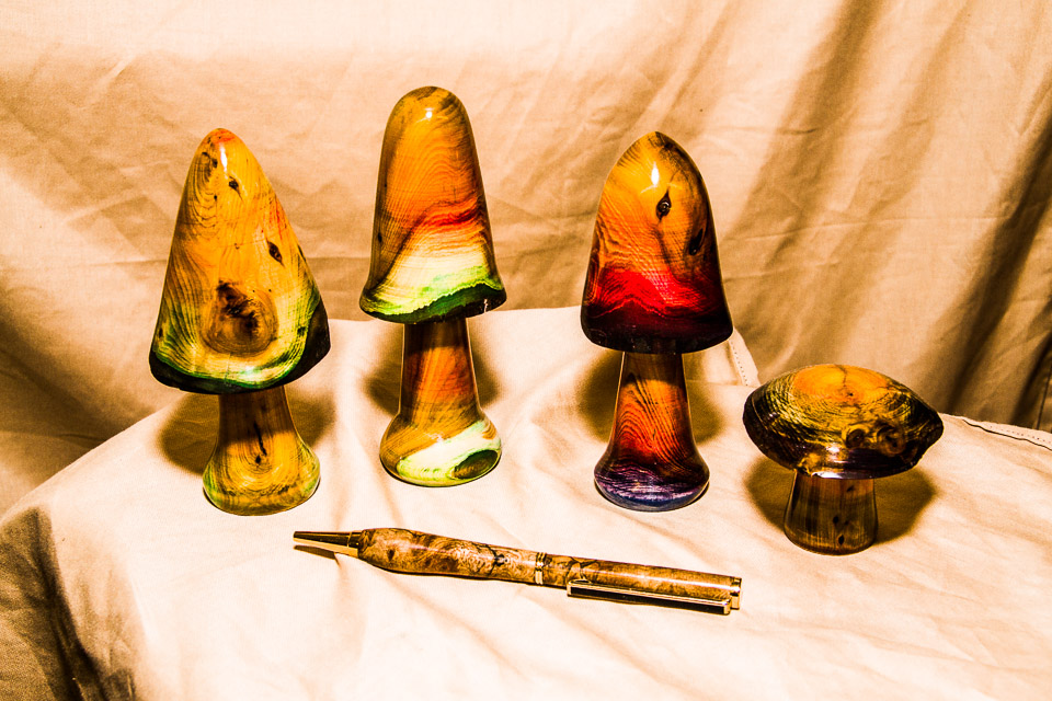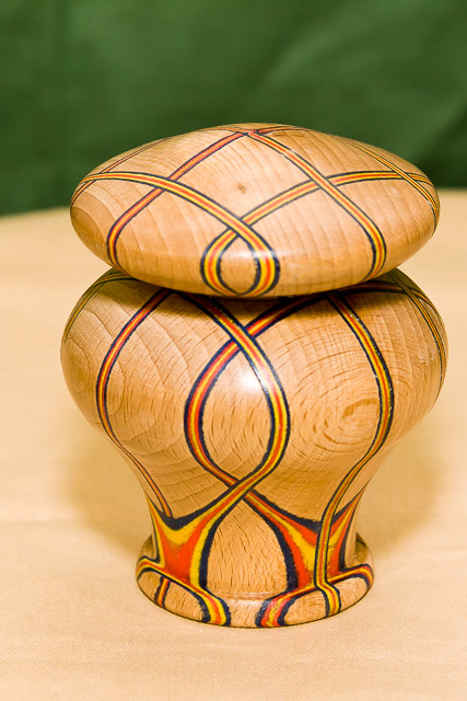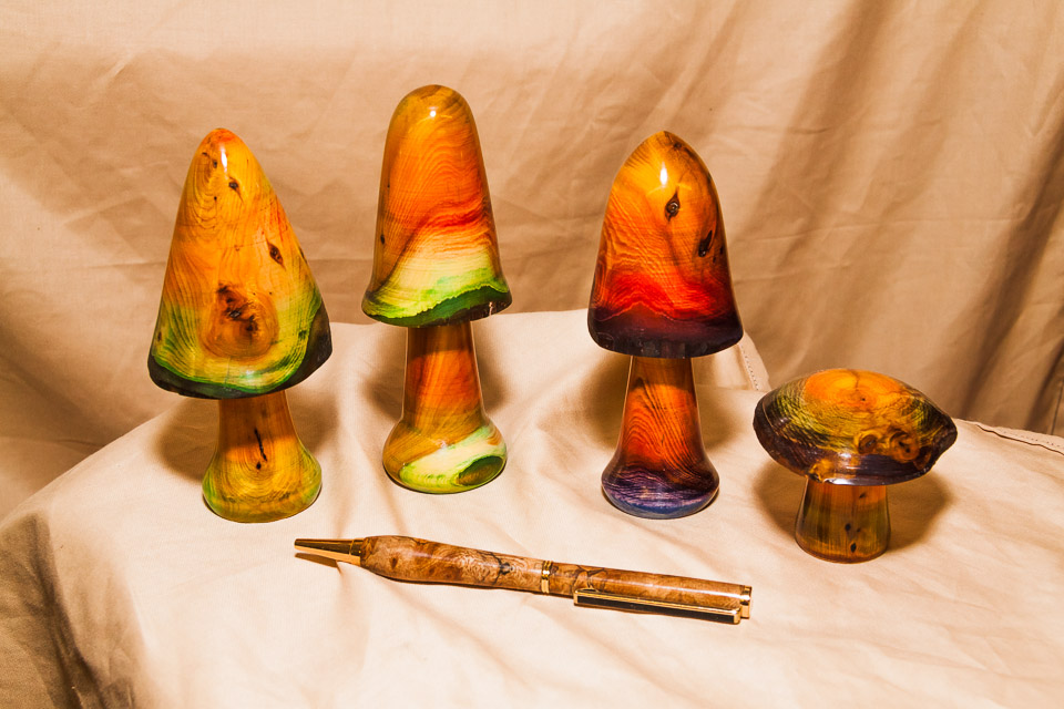 In this gallery pieces shown include - boxes with oriental designs and colouring, fob watch, flower arrangements, goblets with and without captive rings, laminated pieces, pens, apples and pears, vase with boot lacing, skeleton clocks, figures, natural edged pieces, boxes with inlay, many bowls with texturing and colouring, magnifying class, napkin stands, mushrooms and earring/jewellery stands.