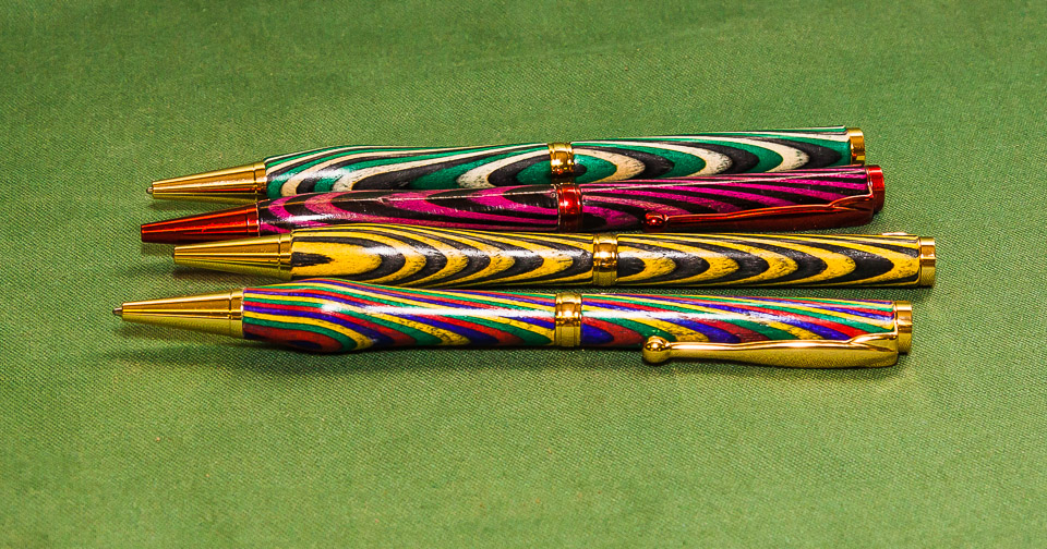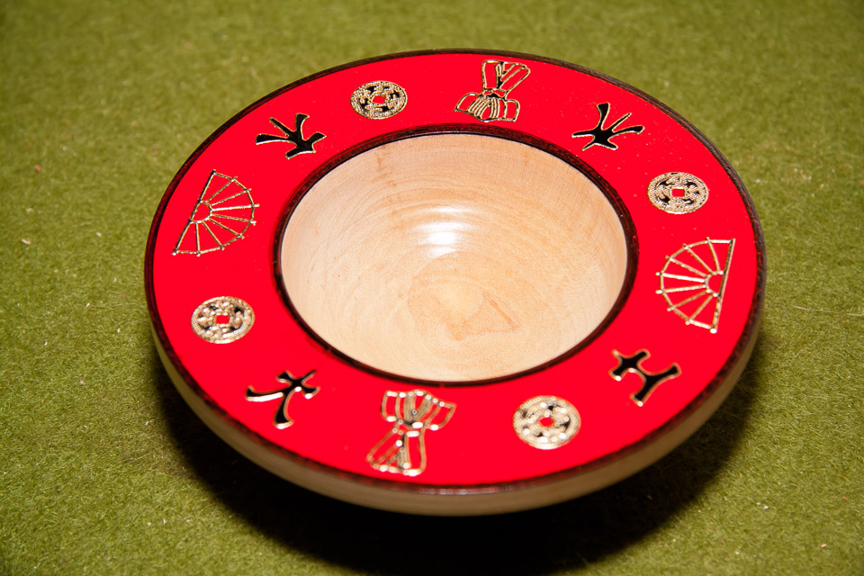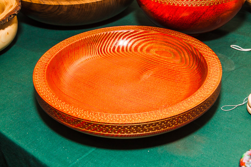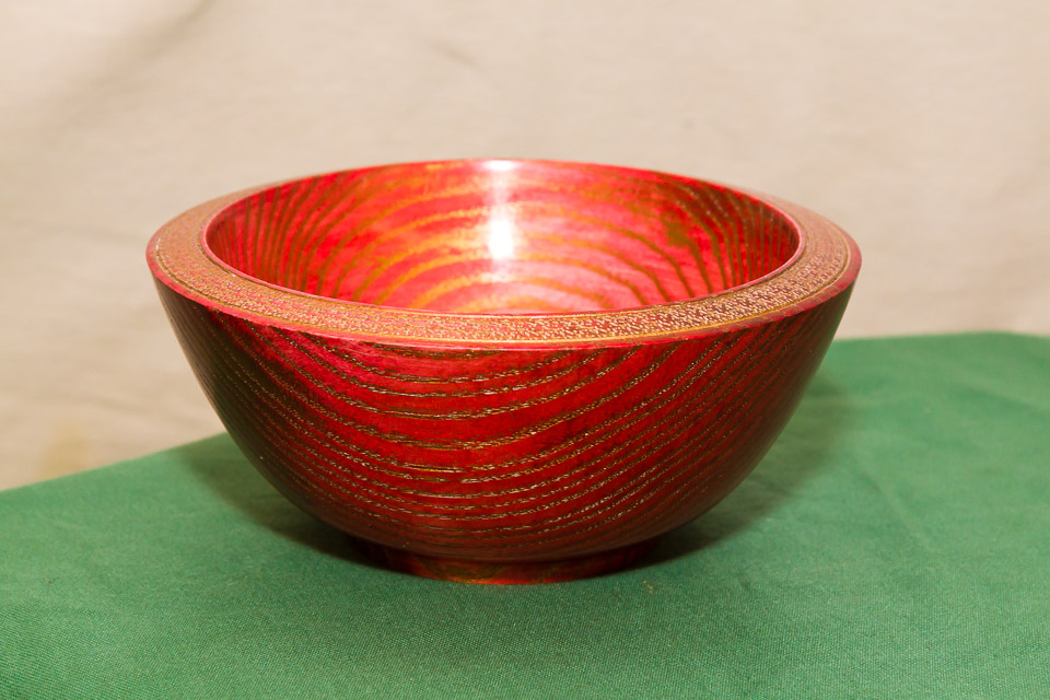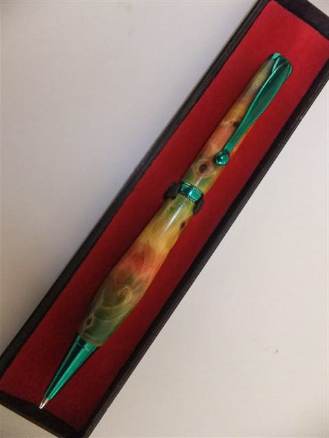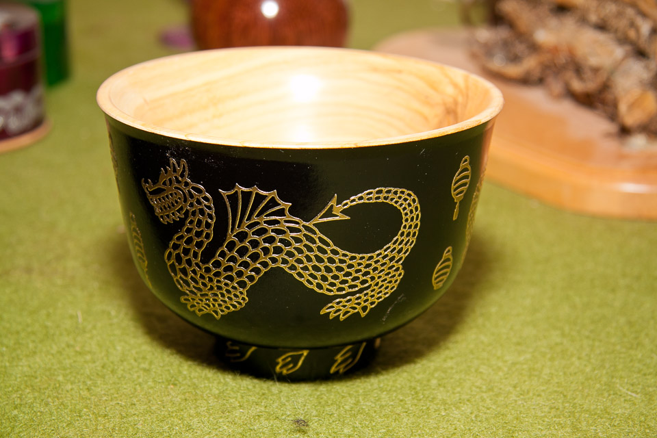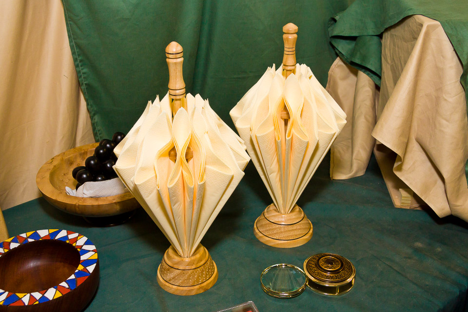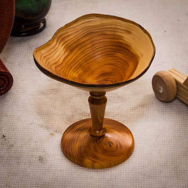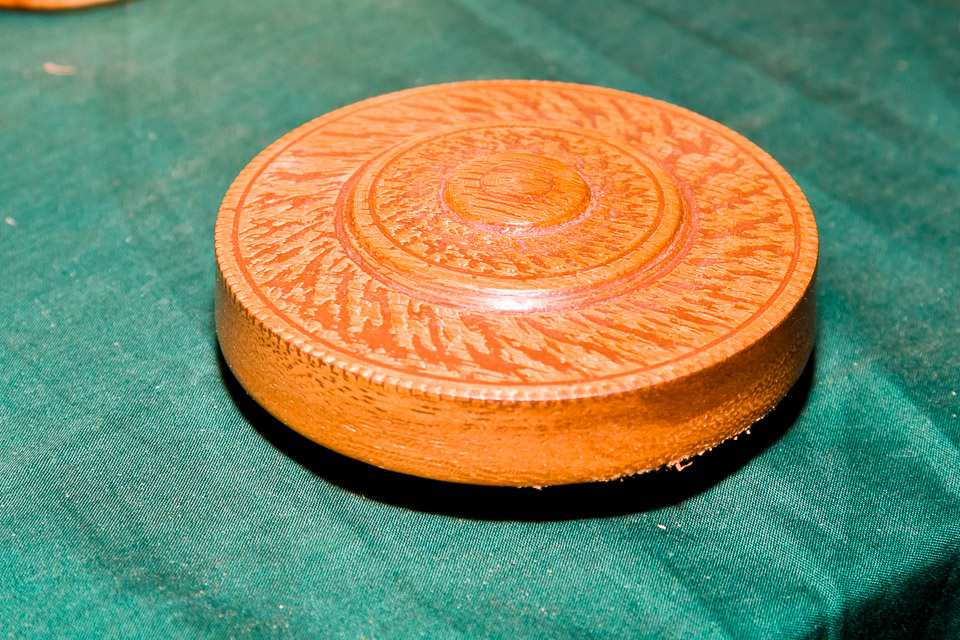 In this gallery pieces shown include - boxes with oriental designs and colouring, fob watch, flower arrangements, goblets with and without captive rings, laminated pieces, pens, apples and pears, vase with boot lacing, skeleton clocks, figures, natural edged pieces, boxes with inlay, many bowls with texturing and colouring, magnifying class, napkin stands, mushrooms and earring/jewellery stands.
