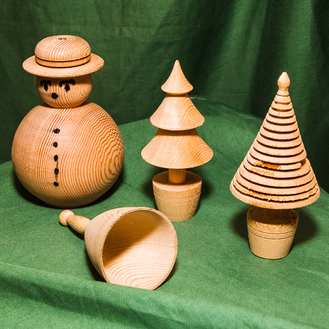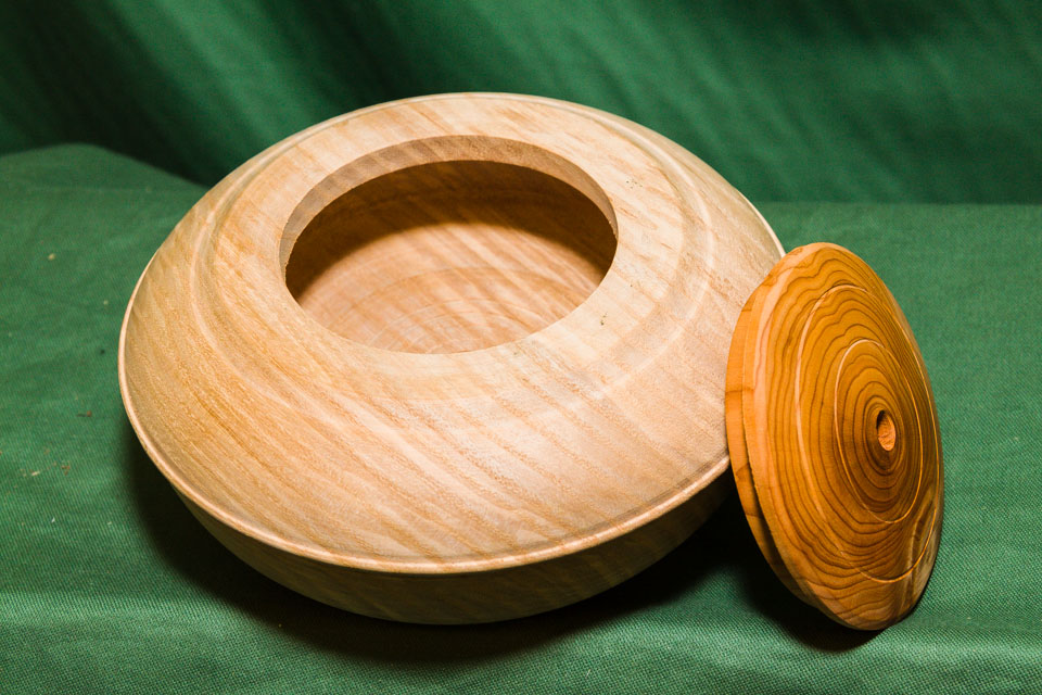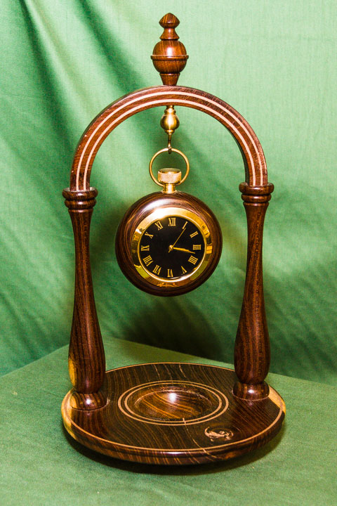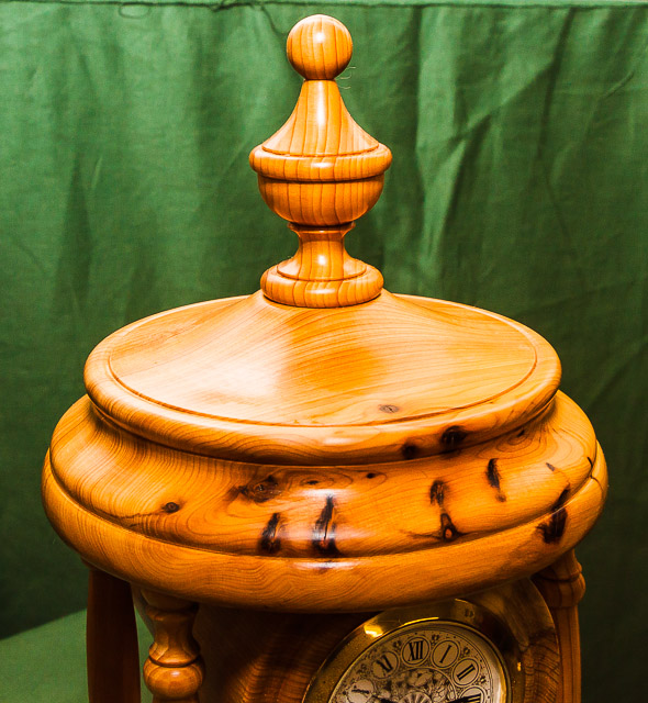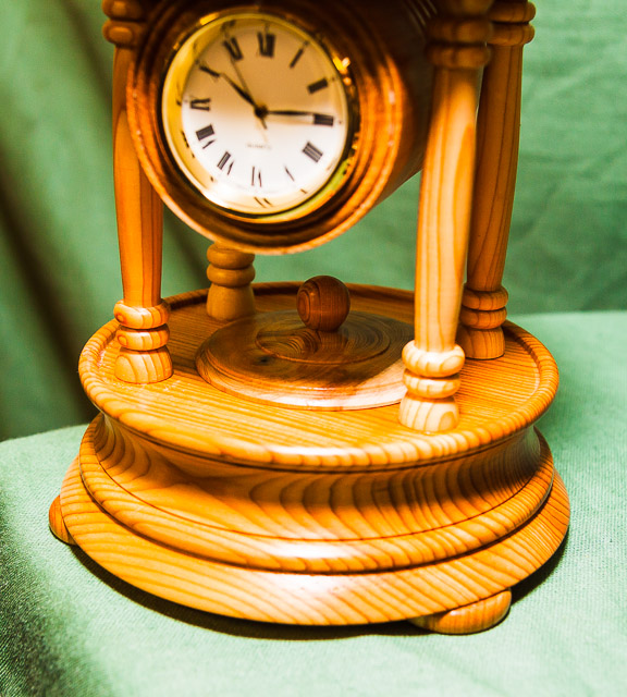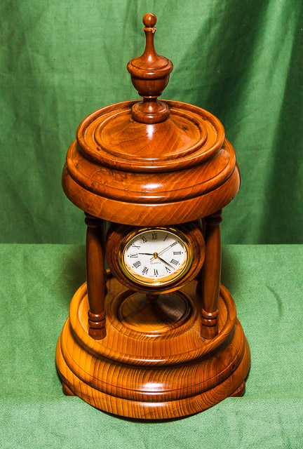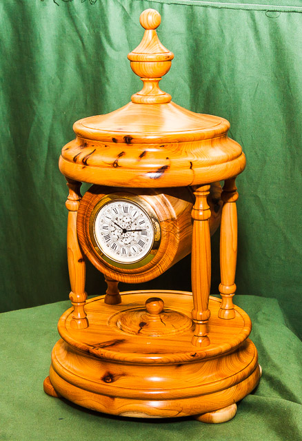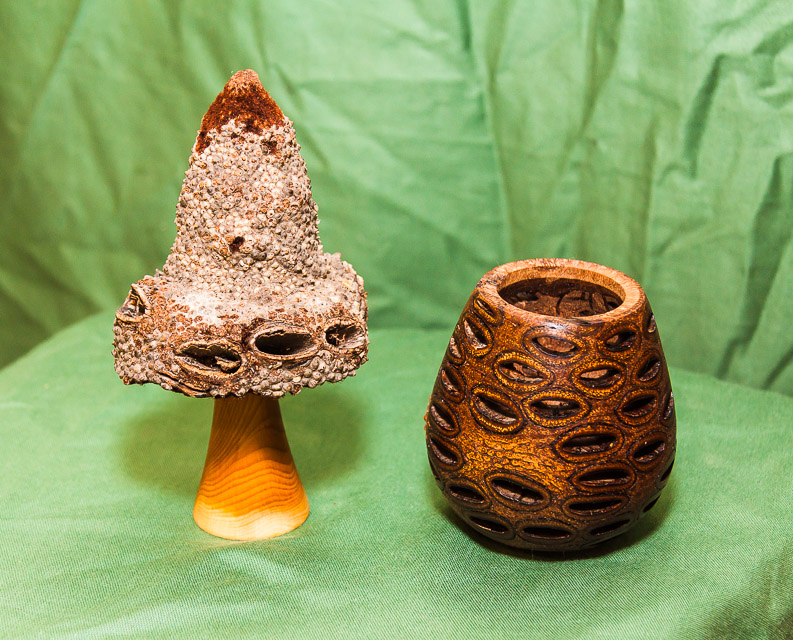 Items exhibited or demonstrated included lidded boxes, gavel and block, pens, banksia nut pieces, carriage and mantel clocks, bells, doorknobs, chess pieces, goblets, a candle snuffer, hollow forms and various demos.