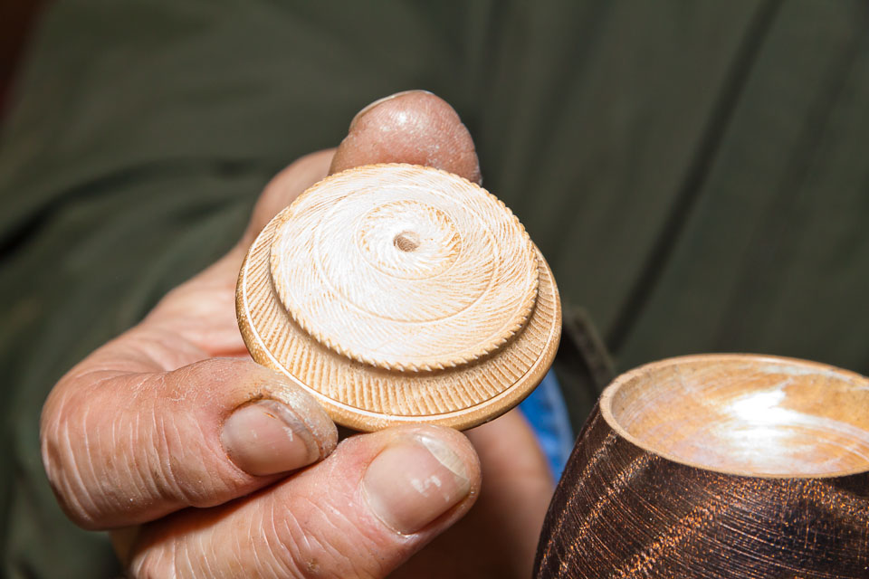 Stuart uses a collection of burrs to pattern both wood and alternative materials. He also uses many home made chisels from quarter inch HSS bar- these enable him to create fine detail.